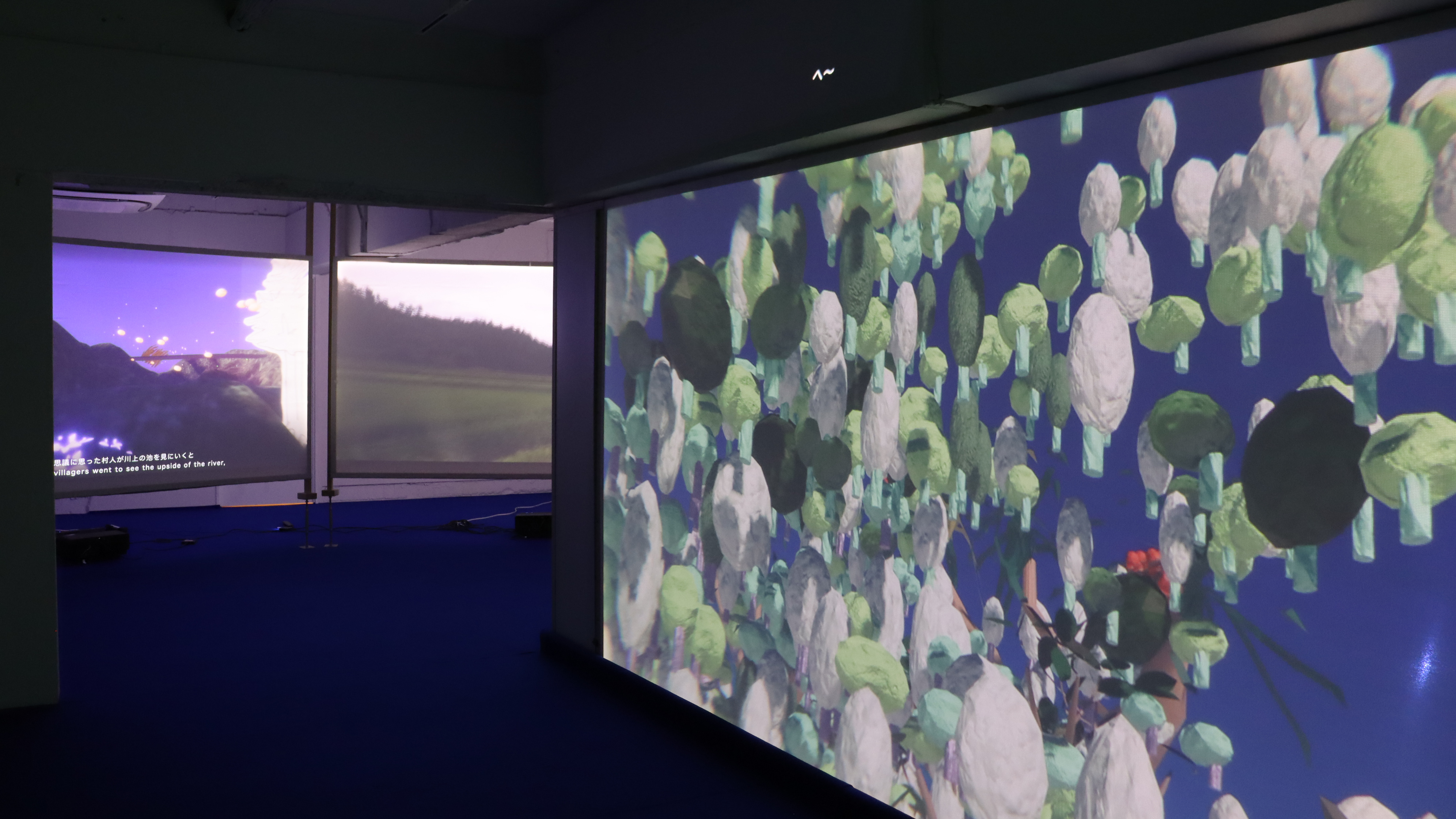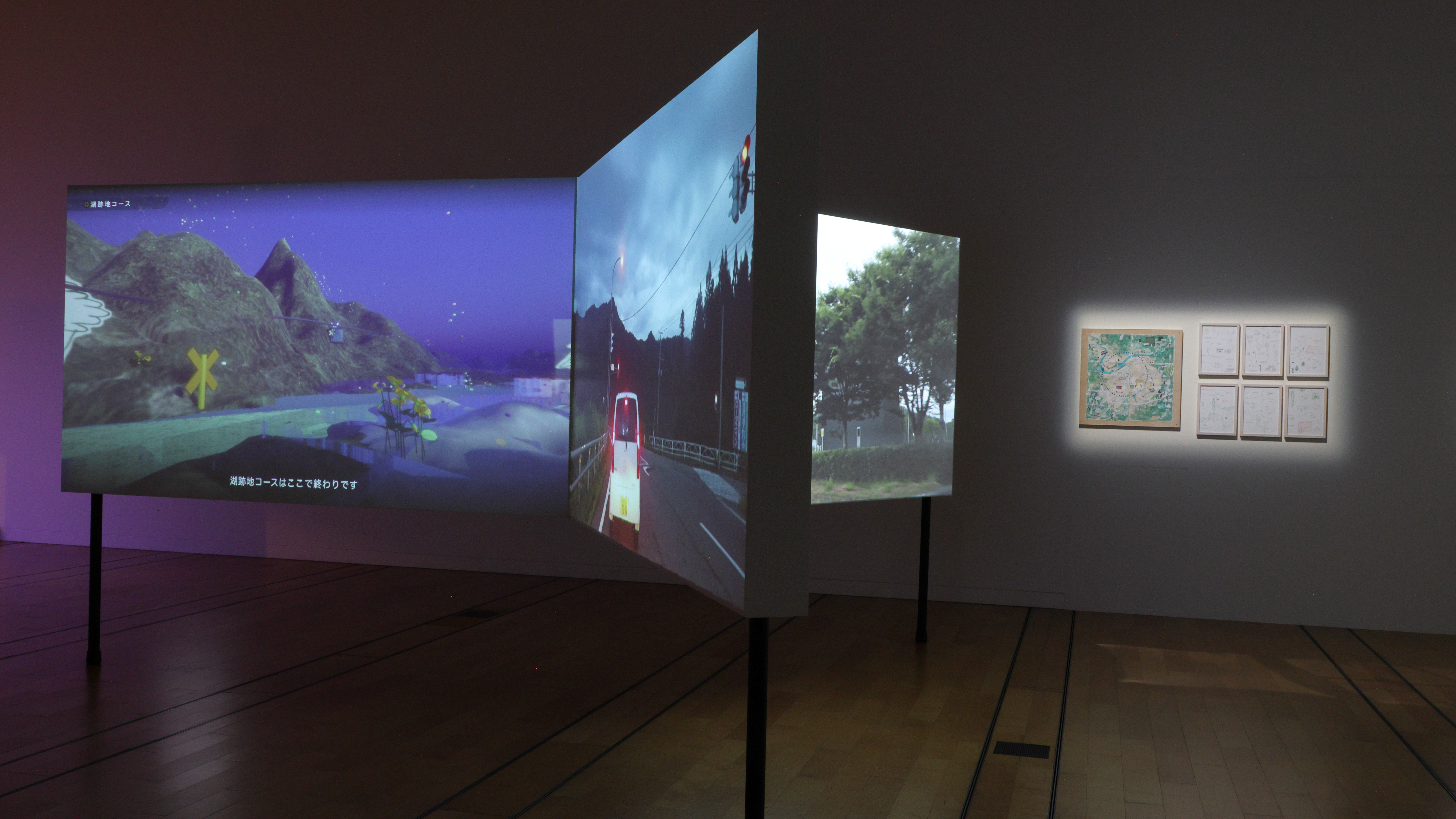 作中に使われる中心新村の地図や写真をもとに、3DCG空間に書き起こされた架空の村